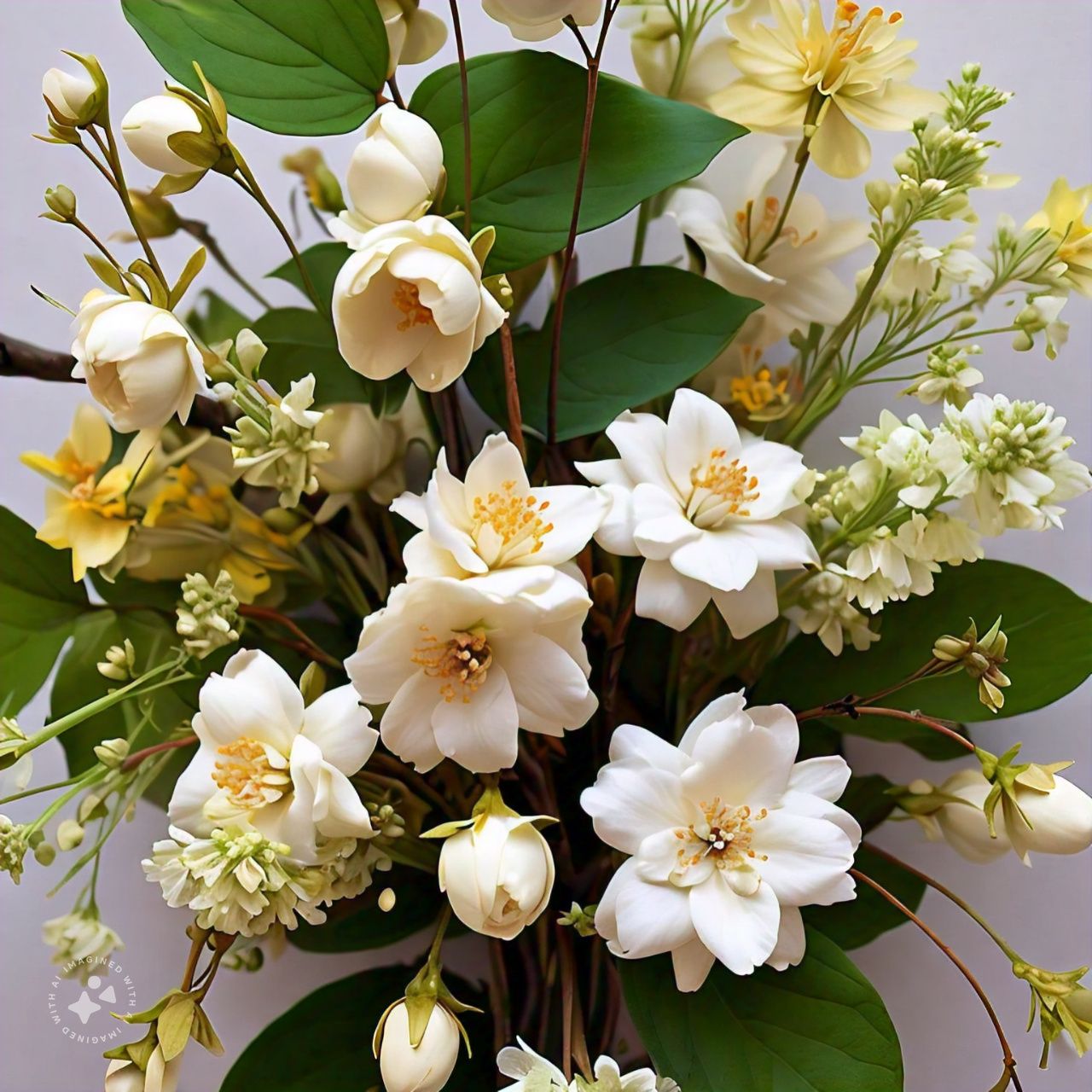 "Delicado arreglo de flores de jazmín, con su aroma suave y exquisito, ideal para transmitir pureza y serenidad en cualquier ambiente."